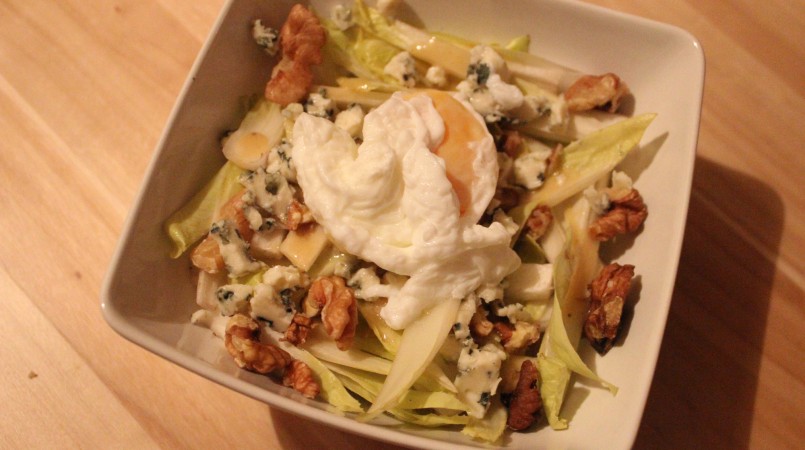 Déposer les endives dans chaque assiette, arroser de vinaigrette, saupoudrer de ciboulette ciselée et de cerneaux de noix, déposer l’œuf et à l'aide d'une râpe, parsemer de copeaux de roquefort.